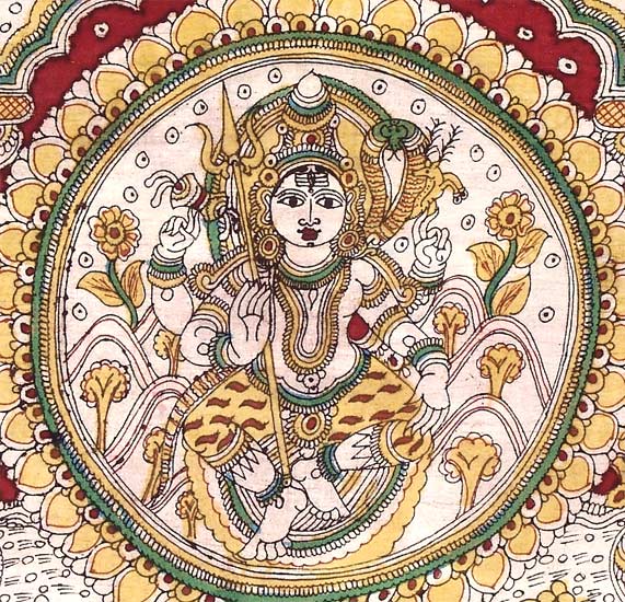 The spectacular Kalamkari painting painting of the Trinity Gods in Hindusim is given a resplendent treatment on cotton. Lord Brahma, Lord Vishnu and Lord Shiva are the three most important and widely revered gods in Hinduism. Lord Brahma is responsible for the creation of the universe, Lord Vishnu for its preservation and the Lord Mahadev is held responsible for the destruction. But destruction of the evil forces is the immediate prelude to a new beginning. Thus Lord Shiva ensures the end of destructive forces and marks the beginning of a new era.