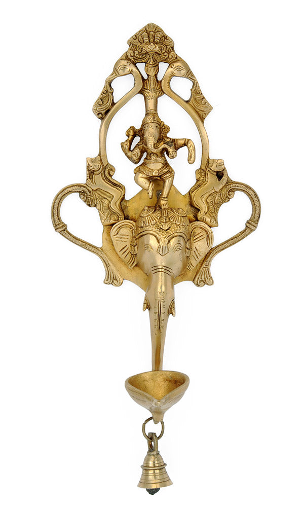The wall hanging lamp of Lambodar is designed in a most prolific and effective manner. The lamp is being fitted with Ganesha's tusk and below is being fitted a bell. A figure of Lord Ganesha in a dancing posture is also being inscribed in the lamp whereas the cool floral and animal designs make the product a prize catch for every art lover. Such hanging lamps are quite popular for all Hindus and are used in every temple or even in home. The light of a lamp helps us get rid of darkness of ignorance and cruelty. A light is a symbol of good wish and happiness.