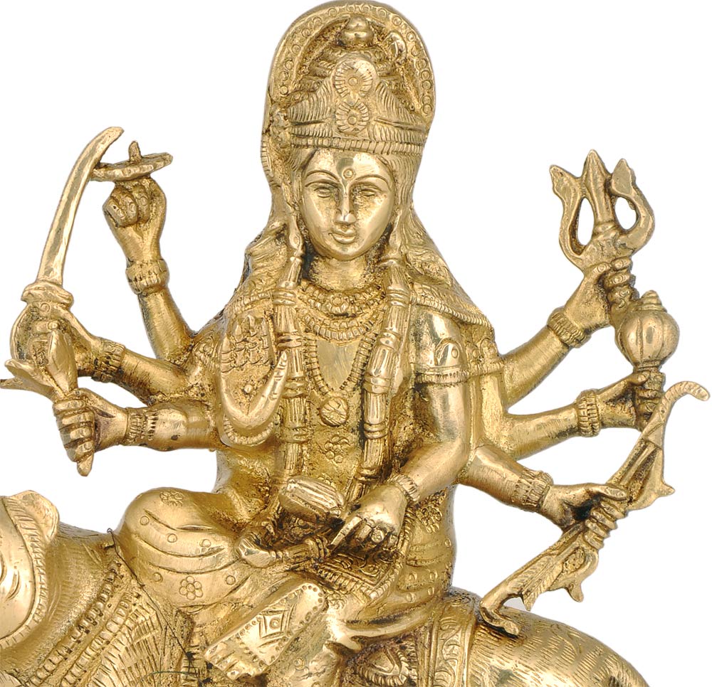 The spectacular brass figure of the Goddess Durga is given a refine and dazzling treatment. The Goddess was born out of the combined energies of different gods in order to eliminate the demon Mahishasur, who had wrought havoc on earth and heaven. The figure is lavishly ornate with some beautiful designs and ornaments as the Goddess Durga is seated on a roaring lion, Her vehicle. One her eight hands, the goddess is carrying different kinds of weapons she received from different gods. A symbol of prowess and strength, the goddess is worshipped all over the country by the Hindus.