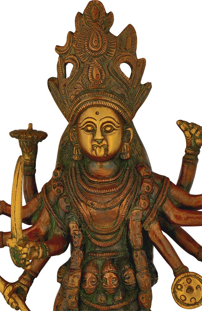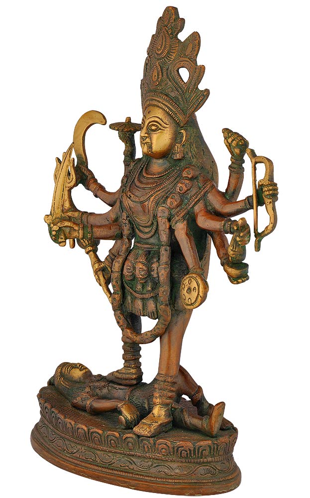 The beautiful brass figure of Goddess Kali is given a nice treatment with some beautiful carvings. Worshipping the Goddess Kali helps us get rid of the evil forces. Kali is a Hindu goddess is a figure of annihilation. Kali is portrayed as being black in color. Her eyes are often described as red with intoxication and in absolute rage. Her hair is shown disheveled, small fangs sometimes protrude out of Her mouth and Her tongue is lolling. She is shown wearing a skirt made of human arms and a garland of human heads. Goddess Kali is also accompanied by serpents and a jackal while standing on a seemingly dead Shiva, usually right foot forward to symbolize the more popular Dakshinamarga or right-handed path, as opposed to the more infamous and transgressive Vamamarga or left-handed path.