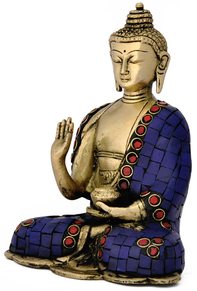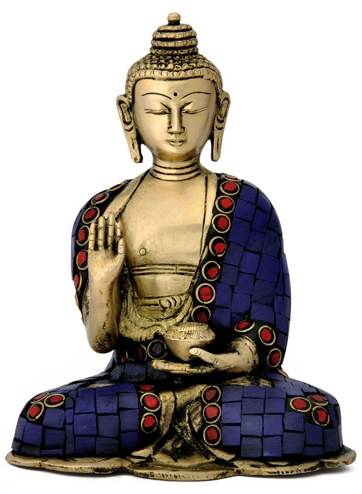 The beautiful brass figure of medicine Buddha is nicely carved out. The Lord is in a meditative posture and he is holding a medicine bowl on his left hand. Brass, reconstituted turquoise and coral are nicely used in this beautiful figure. The indigo colour drapery is covering the half of the body of the Lord. His upper part of the body is left untouched. Medicine Buddha is a fully enlightened being, who is a being who is completely free from the darkness of ignorance. It is believed that Medicine Buddha protects living beings from physical and mental sickness and other dangers and obstacles, and helps them to eradicate the three poisons – attachment, hatred, and ignorance – which are the source of all sickness and danger. He is a Buddha Doctor. Buddha expounded the Sutra of Eight Thousand Verses revealing the instructions on Medicine Buddha.