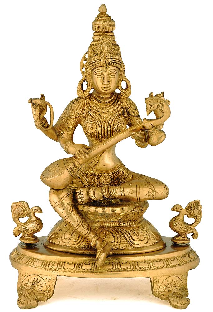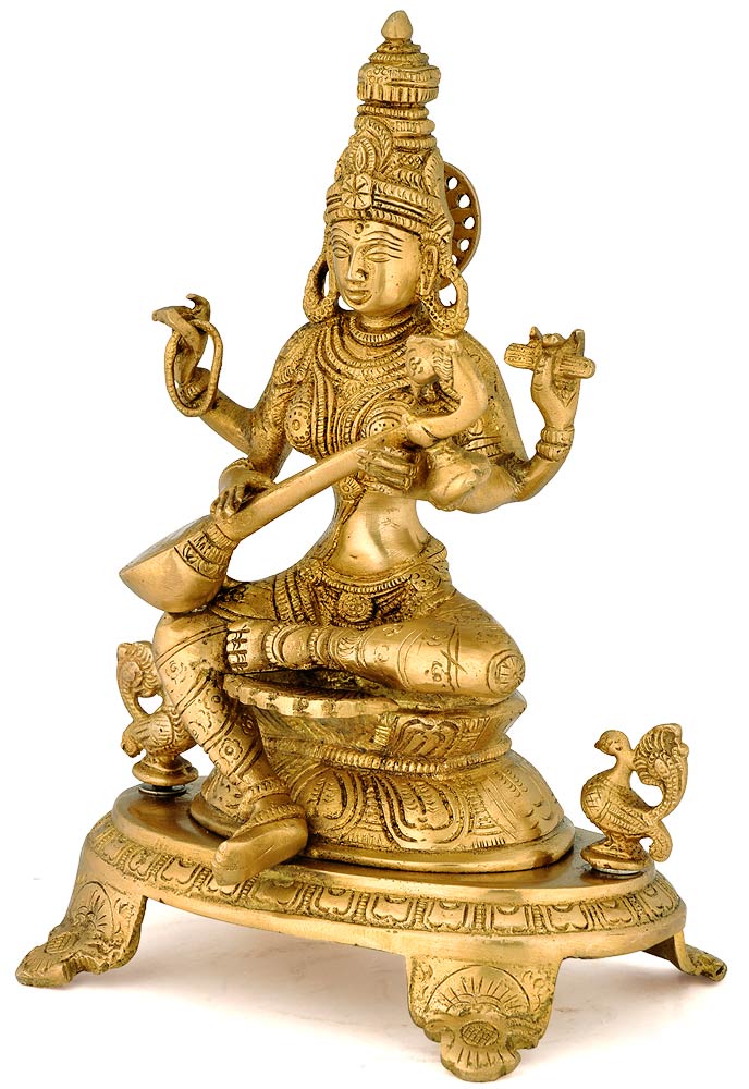 The spectacular brass figure of the Goddess of Learning is given a beautiful treatment. The Goddess is shown playing her vina. Refinement of the statue, the gracefulness of a woman, the sensuality and accomplishment are being aptly showcased in the beautiful wooden figure of the Goddess Saraswati. Her prominent breasts, dazzling ornaments, beautiful designs all make the figure a piece of beauty and sculptural excellence. The figure is full of life and gravity. It reveals a deep sense of aesthetic beauty and grandeur. One of the most important goddesses in Hinduism, the Goddess Saraswati is worshipped by students and musicians alike.