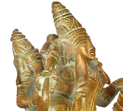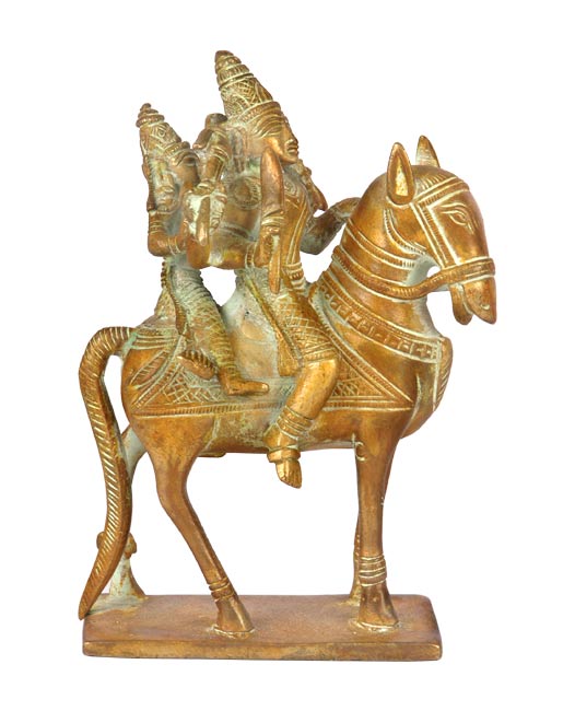 The beautiful image of Lord Shiva and his wife Parvati is being nicely carved out of brass with some sparkling carvings on it. The duo is shown riding on the horseback. Lord Shiva is one of the Trinity gods, the other two being Vishnu and Brahma, and the god along with Parvati are considered the ideal couple in Hindusim