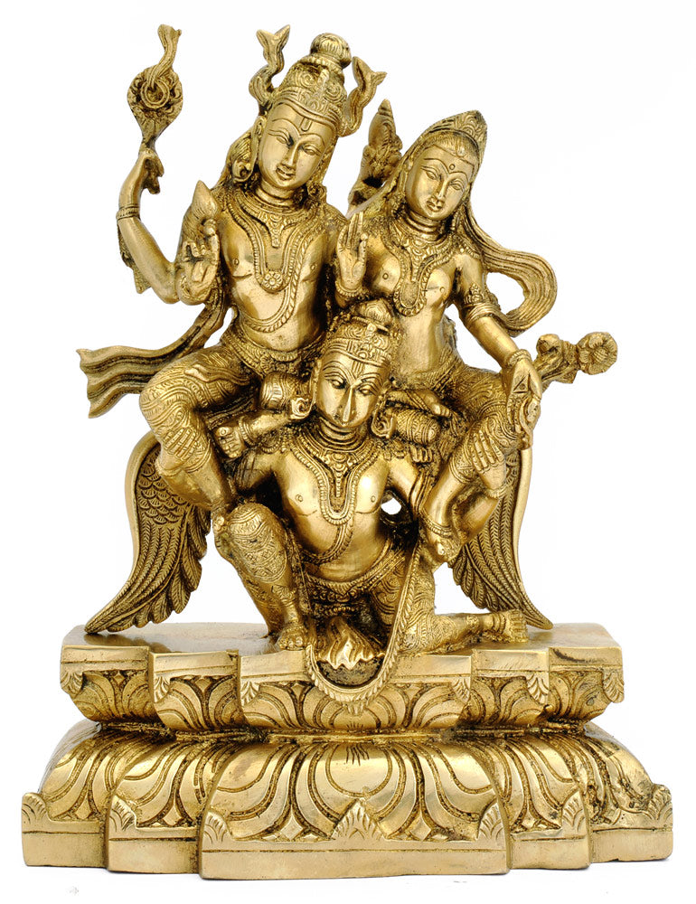 The brass figures of Lord Vishnu (Narayan), his consort Lakshmi and His vehicle Garuda are carved out with a deep sense of finesse and glory. Garuda is shown here carrying his Lord and the goddess at ease on his arms. There are finer carvings and floral designs in the figures and the Lord and His consort Lakshmi both are wearing finer drapery and jewelries. Even Garuda is being given a royal touch. He is holding the legs of both Vishnu and Lakshmi. Lord Vishnu is the Preserver of the Universe and takes incarnations to save the human race whenever some catastrophe looms large. There are refences to ten such incarnations of Vishnu. His consort Lakshmi is the goddess of wealth and prosperity. She is one of the most popular female deities among the Hindus.