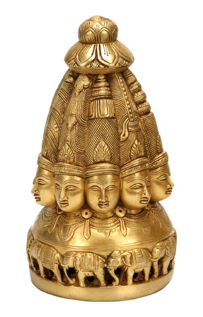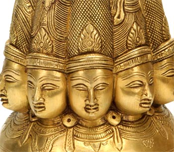 The Ten headed Shiva mandala is nicely carved out of brass with artistic caliber. The elongated heads have been treated with a rare sense of craftsmanship. The elephants below are carved out beautifully. Smoothness of the faces, the heavily decorated heads of the god, the prominent noses, all have made the figure a piece of artistic excellence.