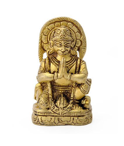 Here a humble small figure of Lord Hanuman, the great devotee of Ramchandra, is nicely carved out of brass. With his folded hands, the Lord is praying. Though not seen, Hanuman is praying for Lord Ram's blessings. His headgear is given a colourful treatment with some nice floral designs. The Lord is also wearing a long garland and some other jewelries. He is bowing down before his master. One of the most widely worshipped gods in Hinduism people keep fast for the Monkey God on every Monday and chant 'Aum aeem bhreem hanumate, shree ram dootaaya namaha’. He is a paradigm of immense energy and strength and courage. Hanuman means "one with prominent or disfigured jaw". According to another theory, his name derives from the Sanskrit terms Han ("killed" or "destroyed") and maana (pride); the name implies "one whose pride was destroyed".