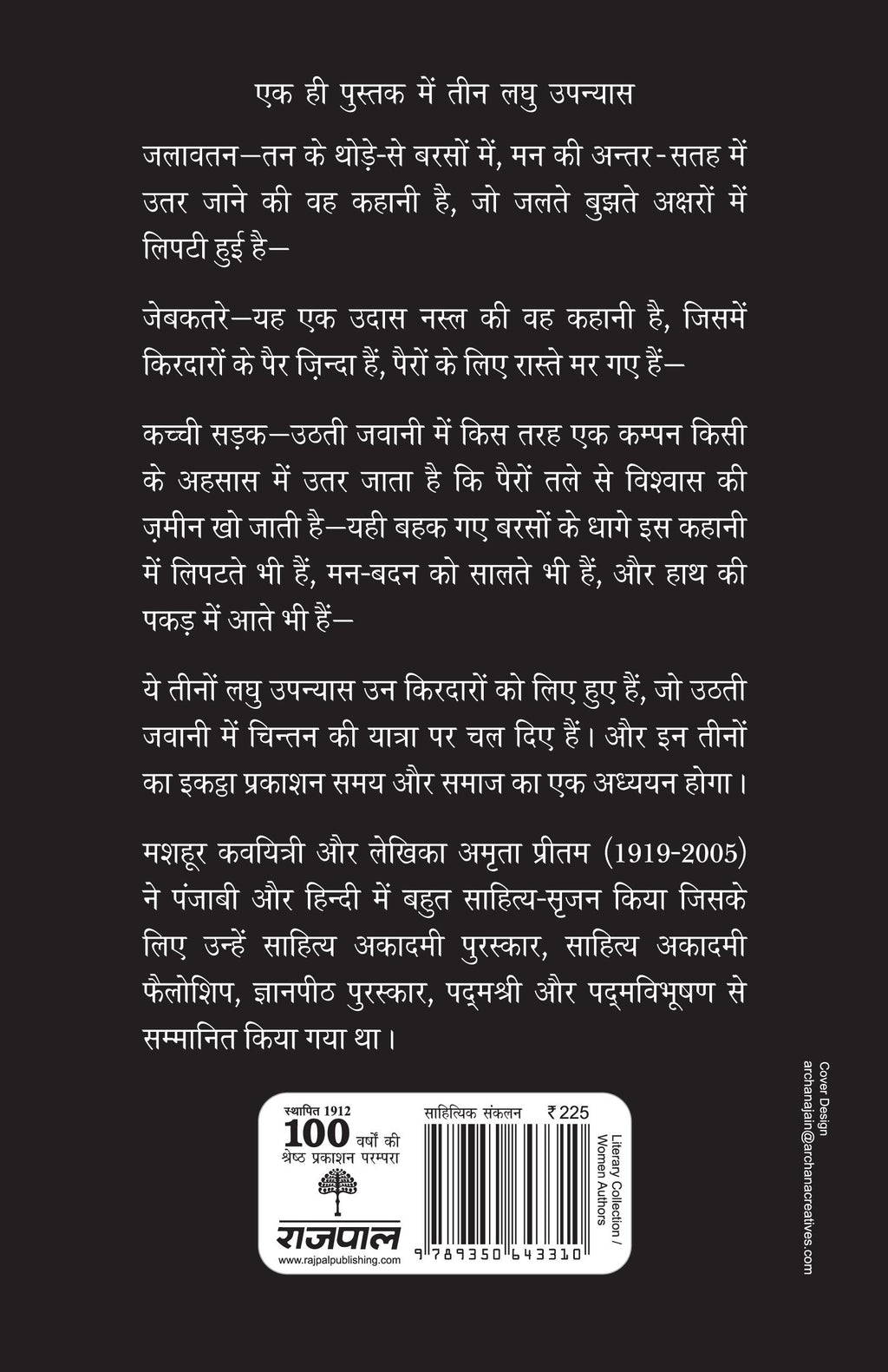 एक ही पुस्तक में तीन लघु उपन्यास। जलावतन-तन के थोड़े-से बरसों में, मन की अन्तर-सतह में उतर जाने की वह कहानी है, जो जलते बुझते अक्षरों में लिपटी हुई है। जेबकतरे-यह एक उदास नस्ल की वह कहानी है, जिसमें किरदारों के पैर ज़िन्दा हैं, पैरों के लिए रास्ते मर गए हैं-कच्ची सड़क-उठती जवानी में किस तरह एक कम्पन किसी के अहसास में उतर जाता है कि पैरों तले से विश्वास की ज़मीन खो जाती है-यही बहक गए बरसों के धागे इस कहानी में लिपटते भी हैं, मन-बदन को सालते भी हैं, और हाथ की पकड़ में आते भी हैं-ये तीनों लघु उपन्यास उन किरदारों को लिए हुए हैं, जो उठती जवानी में चिन्तन की यात्रा पर चल दिए हैं। और इन तीनों का इकट्ठा प्रकाशन समय और समाज का एक अध्ययन होगा। मशहूर कवयित्री और लेखिका अमृता प्रीतम (1919-2005) ने पंजाबी और हिन्दी में बहुत साहित्य-सृजन किया, जिसके लिए उन्हें साहित्य अकादमी पुरस्कार, साहित्य अकादमी फैलोशिप, ज्ञानपीठ पुरस्कार, पद्मश्री और पद्मविभूषण से सम्मानित किया गया था।