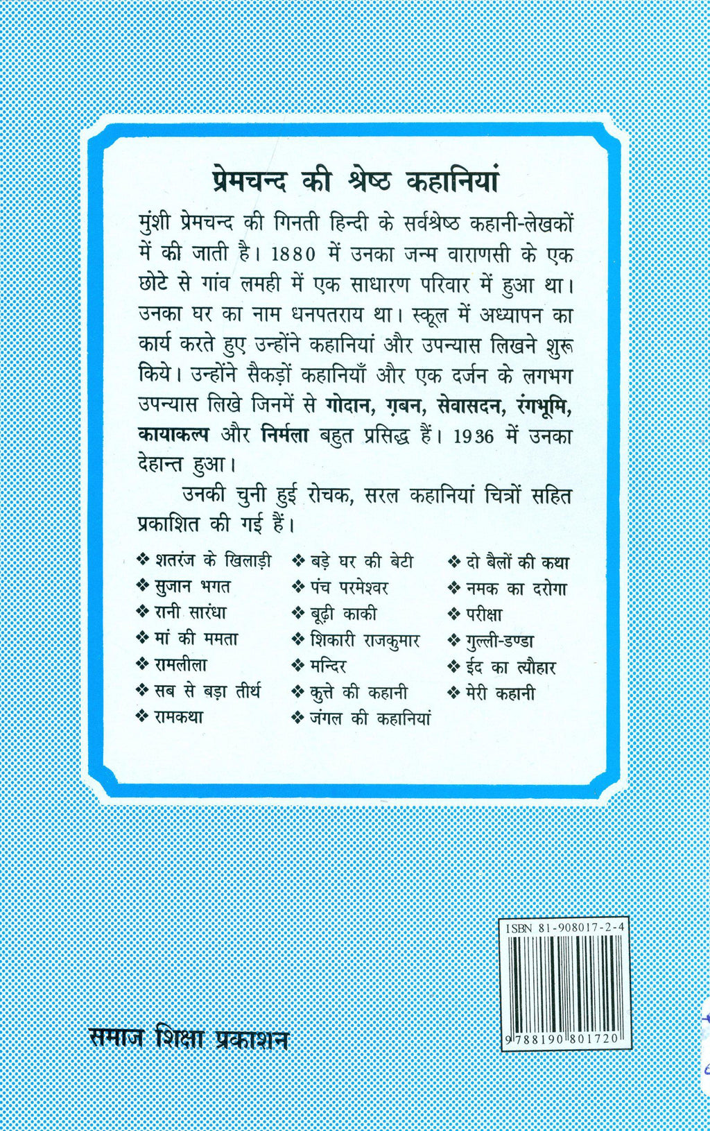 मुंशी प्रेमचन्द की गिनती हिन्दी के सर्वश्रेष्ठ कहानी-लेखकों में की जाती है। 1880 में उनका जन्म वाराणसी के एक छोटे से गांव लमही में एक साधारण परिवार में हुआ था। उनका घर का नाम धनपतराय था। स्कूल में अध्यापन का कार्य करते हुए उन्होंने कहानियां और उपन्यास लिखने शुरू किये। उन्होंने सैकड़ों कहानियां और एक दर्जन के लगभग उपन्यास लिखे जिनमें से गोदान, ग़बन, सेवासदन, रंगभूमि, कायाकल्प और निर्मला बहुत प्रसिद्ध हैं। 1936 में उनका देहान्त हुआ।