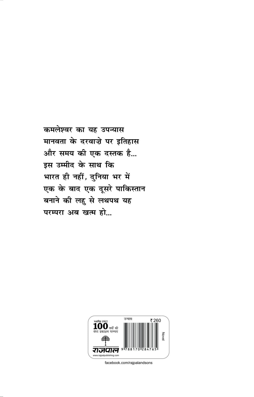 कमलेश्वर का यह उपन्यास मानवता के दरवाजे पर इतिहास और समय की एक दस्तक है...इस उम्मीद के साथ कि भारत ही नहीं, दुनिया भर में एक के बाद एक दूसरे पाकिस्तान बनाने की लहू से लथपथ यह परम्परा अब खत्म हो...।