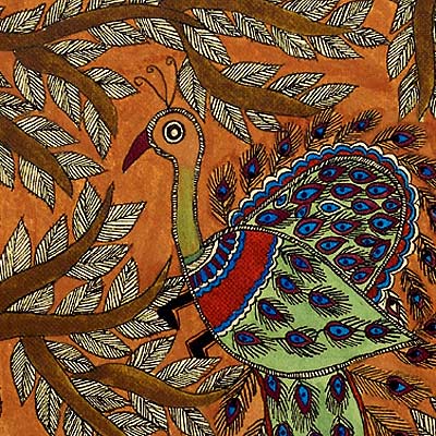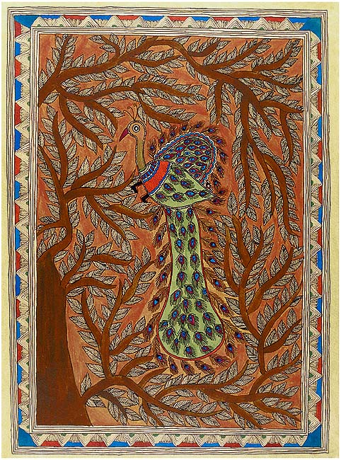 The spectacular Madhubani painting depicts a beautiful peacock in full bloom on a tree. One of the most popular birds in India, peacock is India's national bird and is held in high esteem. The Indian peacock is a colourful, swan-sized bird, with a fan-shaped crest of feathers, a white patch under the eye and a long, slender neck.