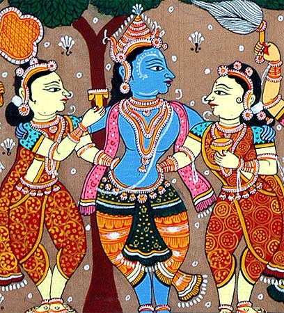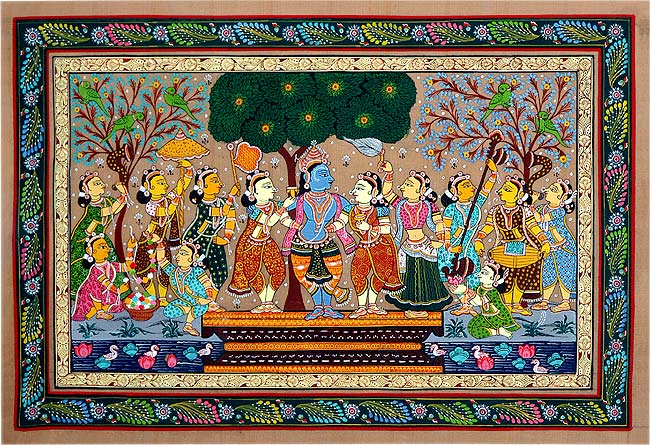 The beautiful Patachitra painting depicts the Lord Krishna being surrounded by the gopis. Lord Krishna was extremely popular among the young gopis and they went out of their household chores to meet their beloved and affectionate Krishna. Derived from the Sanskrit words patta (a piece of cloth), chitra (painting or picture), Patachitra is a folk art form drawn on a piece of silk, cotton or any other fabric, portraying traditional motifs and imageries of religion and society. Natural colours are profusely used to depict mythological themes.