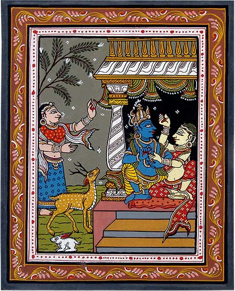 The beautiful Patachitra painting nicely depicts the saga of love between Lord Krishna and Radha in the midst of all animals, gopis. Even the courtyard is also nicely depicted. Colour patterns and floral designs are given refine treatment. Spectacular pictorial conceptions, characteristic conventions and vibrant color patterns make the Patachitra a unique treasure in the rich coffer of Indian ethnic art. Primarily executed on cloth, using natural colors, these ethnic paintings have charmed admirers across the globe.