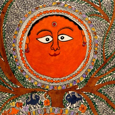 In this spectacular Madhubani painting, the Sun is painted sparkling red. The Sun is painted at the centre and is surrounded by minor creatures. The painting shows the centrality of the sun god to the lives of the Mithila people. The painting shows the religious beliefs of the simple people of Mithila for who the sun is the ultimate source of all energy and the Sun is held in high esteem and is worshipped with devotion.