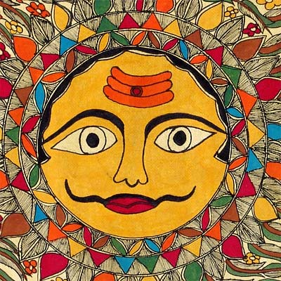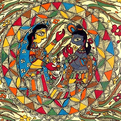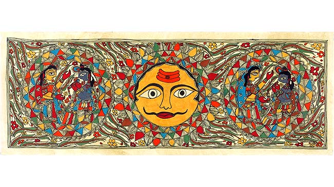 The beautiful Madhubani painting depicts the Lord Krishna and His consort Radha along with the Sun, the source of our energy. Sun is painted at the center whereas the Lord Krishna and His consort Radha are painted on the right and left side of the Sun. The beautiful painting reflects the simple philosophy of life of the people of Mithila that the Sun and the Lord are equivalent, the omnipotence of the Lord: His male and female manifestation. Red, blue, green and mustard colours have been nicely combined together to yield a nice blending of colours. Natural and mythological motifs are common in Madhubani style of painting, centred around Mithila of Bihar.
