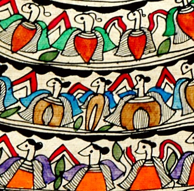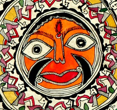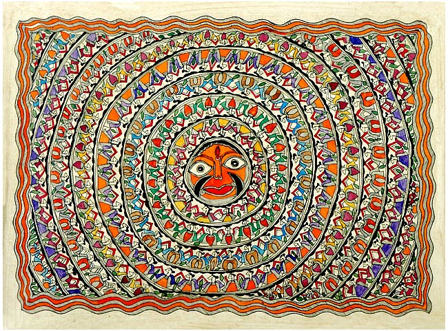 The popular beliefs of the Mithila region gets reflected in the beautiful Madhubani painting that puts the figures in a human chain and in circular form. Cosmic beliefs of the people are getting reflected in the painting. Madhubani paintings are centred on Bihar and this type of painting uses purely natural dyes and handmade paper. The protector God has been given a central place in the painting and his role in protecting the people is evident.