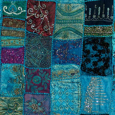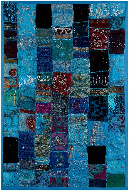 The beauty of a deep starry night gets a vivid portrayal in the beautiful wall hanging as some spectacular bead works, sparkling sequins and marvelous mirror works create sort of heaven on the cotton fabric. Blue, indigo, red and black patchwork designs have been nicely knit together in the traditional Gujarati style. The borders of the wall hanging are also marked beautifully.