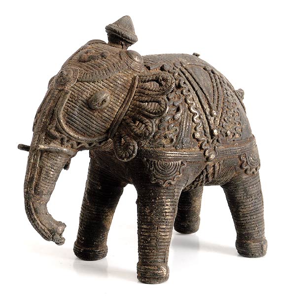 The pachyderm gets a royal treatment in this spectacular brass figure. A symbol of gravity and prosperity, elephant is a status symbol for the tribal people of North India. The brass figure is cast in the traditional Dhora technique. Lost wax method is a laborious technique of casting brass figure and it is practiced in North India. In this technique, first a model is sculpted of clay and dried in the sun. Then it is covered with beeswax and more clay and a mold is formed. The piece is cast, cleaned and again dried in the sun. Finally, it is heated in the ground for five days and polished.