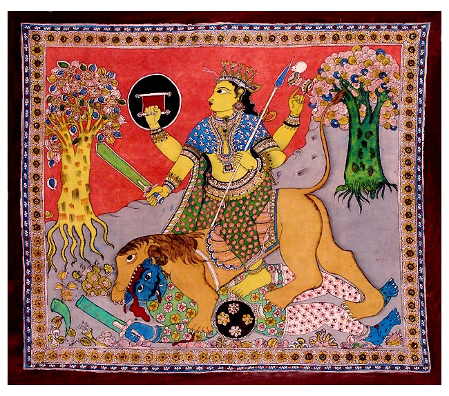 The beautiful Kalamkari painting depicts the Mother Goddess killing the demon Mahishasur. The goddess has been painted with some natural colours and the treatment given the lion, the demon king as well as the surroundings are really attractive. The enhancing effulgence of colours and the characters that emerge on cotton fabric, help create a resplendent spread in the beautiful painting. Kalamkari art is unique in its use of colour as a medium to portray mythological characters. As the name suggests, Kalamkari is the art of painting cotton fabrics with a kalam i.e. pen, a sharp pointed pierced bamboo that regulates flow of colour on the fabric.
