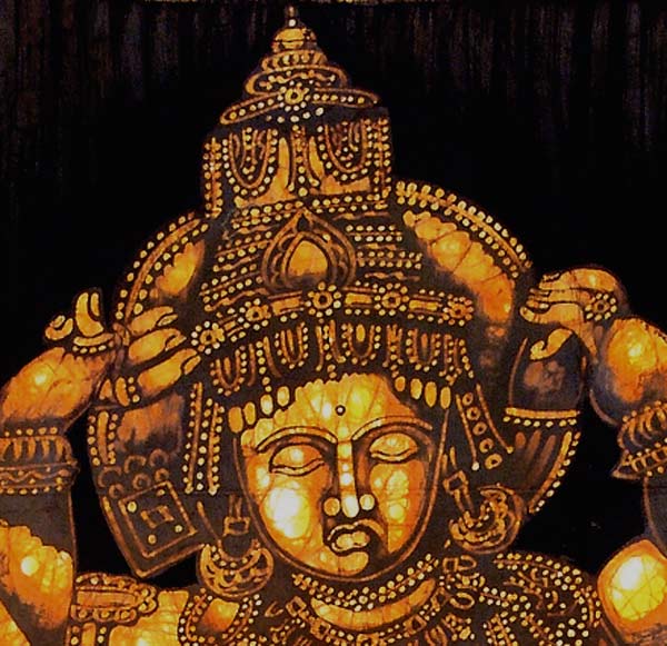 Goddess Durga is one of the most powerful goddesses in Hinduism and she is the incarnation of the collective powers of all the gods and goddesses. She was born to kill the demon Mahishasur who wrought havoc in heaven and earth. The beautiful Batik painting shows the mother goddess killing the demon with weapon. The form of Batik is one of the most popular art forms in India and it reflects a deep sense of pattern and colour.