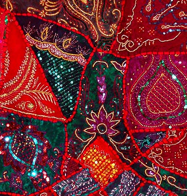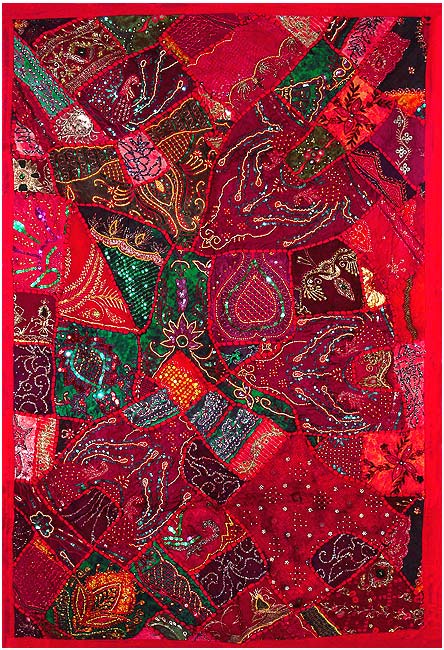 A deep sense of grandeur and magnificence marks the spectacular wall hanging with a number of floral designs. Amazing embroidery work, marvelous mirror work beautify the hand made wall hanging that also celebrates the glory of the rich tradition of Gujarati patchwork. Patchwork is often combined with appliqu and basic geometric shapes are usually used in the making of most of the patch work items. Patchwork in India is mainly popular in Gujarat and Rajasthan. Various coloured and patterned fabrics of different shapes and sizes are together on a plain background. An important feature characterizing Indian patchwork is that the stitches of the patches are not hidden but are done with jazzy shades which get highlighted, adding a more artistic appeal