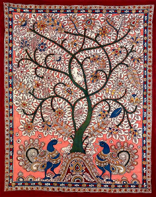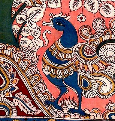 The beautiful peacocks dancing in full glow under the resplendent tree is indeed a masterpiece in the traditional Kalamkari style of painting. The effulgence of colours and the characters that emerge on cotton fabric, help create a resplendent spread in the painting. Kalamkari art is unique in its use of colour as a medium to portray mythological characters. As the name suggests, Kalamkari is the art of painting cotton fabrics with a kalam i.e. pen, a sharp pointed pierced bamboo that regulates flow of colour on the fabric and this form of painting is centred on Kalahasti of Andhra Pradesh.