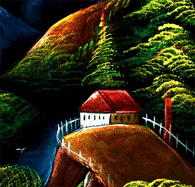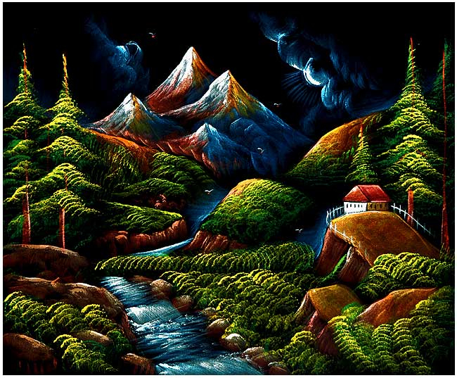 A true dreamland with snow-capped mountains plus the ever-flowing river from the mountains and the lush greenery all are given a classic treatment in the beautiful velvet painting. Some small huts on the mountains and birds flying high give some added sparks to the beautiful painting. Velvet paintings are quite popular in North India and their orgin may be traced back to Kashmir.