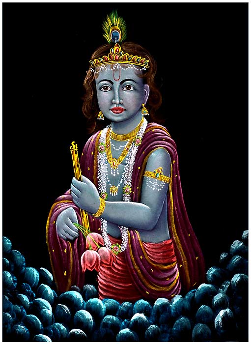 A rare sense of innocence and childlikeness is manifest in the sparkling velvet painting that depicts the Lord Krishna holding a bunch of flowers on his one hand and his flute on his other hand. The child Krishna is wearing lot of sparkling ornaments and garlands. His spectacular headgear, red lips, sharp nose, broad eyes all are given a minute and detail treatment.