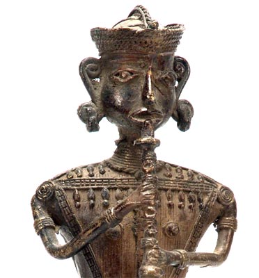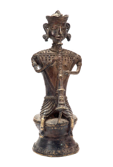 The tribal musician is playing a local musical instrument and is shown in a casual mood by the sculptor. The beautiful figure of bell metal has been crafted in the traditional ‘dhokra’ method and it reflects the refinement of the sculptural technique. Dhokra method of crafting tribal statues has been in use among the tribal people of Central and North India. Here the tedious lost wax method has been used.