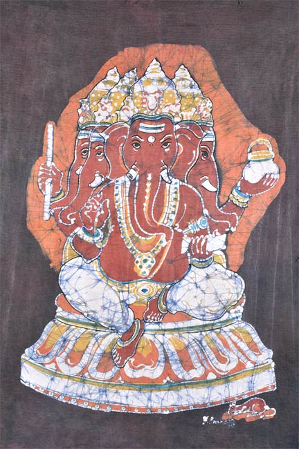 The beautiful Batik painting of Sree Ganesha is given a refine and nice treatment. One of the most popular gods in Hindusim, Lord Ganesha is here seated cross-legged and he appears quite grave and accomplished. Colour treatment is fine and a deep sense of devotion is generated among the onlookers. In this technique of painting, certain parts of the cloth are covered with a dye resistant substance like wax to stop them from absorbing the dyes and thereby they give shape to specific patterns. As these patterns are drawn on the clothes and are not weaved, the painter or artist has more room for to express his creativity. Such paintings are also more durable. Religious themes as well as abstract patterns are portrayed in these paintings.