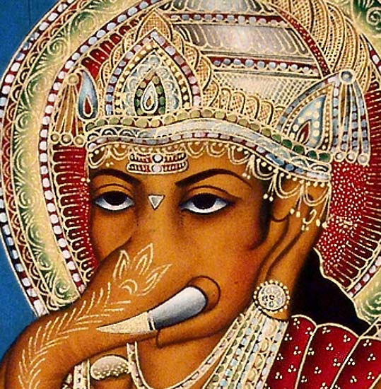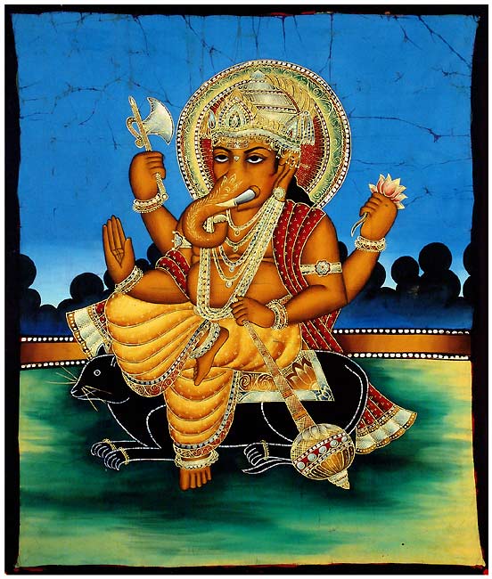 The beautiful painting of Lord Ganesha in traditional Batik style reveals a deep sense of devotion and aesthetic beauty. The Lord of Wisdom is seated on his vehicle, a mouse and is in serious mood. The figure of the mouse is given a fine depiction using some black outlines. The heavily ornate figure is decorated with some beautiful designs and style