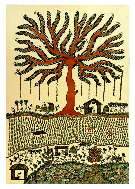 The lush greenery of an Indian village is the treat for the eyes and the beautiful Warli painting is the second best thing to happen after the greenery of a village. The brunches of the trees with birds taking rest on them have been beautifully painted. The huge tree encompassing the village life is giving protection to the people who have also been painted with their day-to-day lives. The paddy field has also been vividly depicted providing solace to the suffering souls. One person is also depicted protecting the paddy field. After all it is a vivid portrayal of the greenery of a village life.