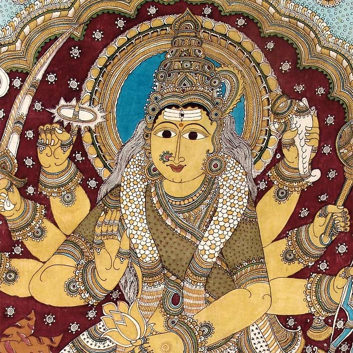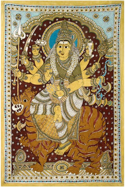 The beautiful Kalamkari painting depicts goddess Durga in a most accomplished and fitting manner. Goddess Durga was created out of the combined forces and energies of all the gods and goddesses to kill the demon Mahishashur who wrought havoc on Earth and Heaven. She is one of the most popular goddesses in Hindusim and is widely worshipped in the Eastern part of the country (like Bengal, Orissa and Assam). For the Bengali community the Autumn season holds tremendous importance as it is the period when the Durga Puja is celebrated with enthusiasm and gusto.