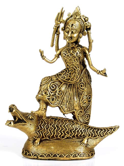 The Goddess Ganga is riding on a crocodile. The beautiful brass figure reveals religious beliefs of the tribal populace. The beautiful brass figure reveals an ancient method of casting brass figures. A shining example of the ancient Dhokra method, here the figure is created through a laborious lost wax method practised by the tribal groups of north India. In this ancient craft, a model is sculpted out of clay and dried in the sun. It is then covered with beeswax and more clay, forming a mold. The piece is cast, cleaned and again dried in the sun. Finally, it is heated in the ground for five days and polished.
