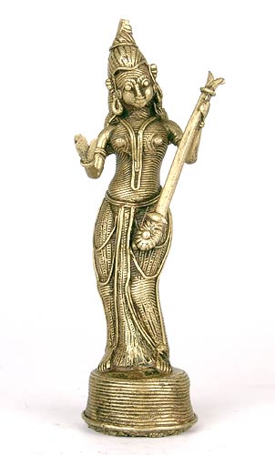 One of the most popular goddesses in India, Saraswati is worshiped by students across the country. She is the repository of learning and education. In this spectacular Kalamkari painting, she is holding her veena on her left hand.. A shining paradigm of beauty and an example of the ancient dhokra technique, the figure is crafted through a laborious lost wax process associated with the tribal groups of northern India. A model is sculpted of clay and dried in the sun; it is then covered with beeswax and more clay, forming a mold. The piece is cast, cleaned and again dried in the sun. Finally, it is heated in the ground for five days and polished. Lost wax is laborious method that entails four distinct phases: 1) creation of the wax model 2) forming the mold around the wax model 3) casting of the mold and 4) finishing of the piece.