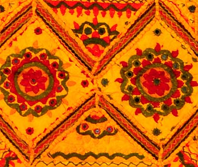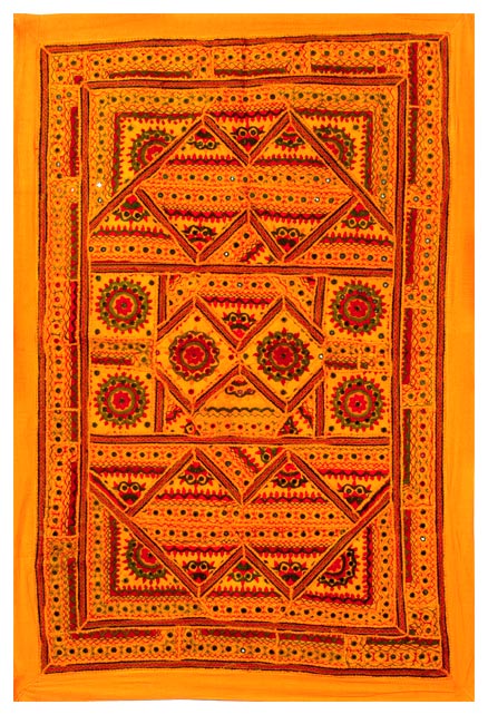 The beautiful wall hanging has reflected the rich traditions of patchwork of Gujarat in a befitting manner. The light yellow colour of the wall hanging is a testimony of artistic excellence. Sequins, fine beadworks and beautiful mirror works have added some beautiful impact to the wall hanging. A piece of rare beauty the borders of the wall hanging are beautifully decorated.