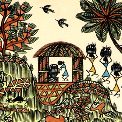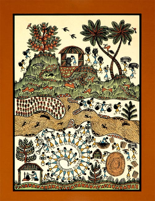 Tribal people are closely intimated with nature. There is a symbiotic relationship with the nature. This kind of relationship is being depicted in the beautiful painting on the Warli tribe. The tree has been beautifully painted showing the centrality of the trees to the lives of the Warlis. Warlis are brought up on the lap of nature and nature gives them plenty of food and shade.