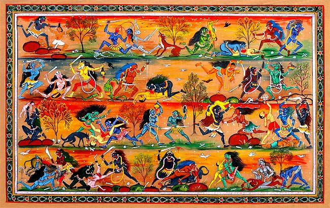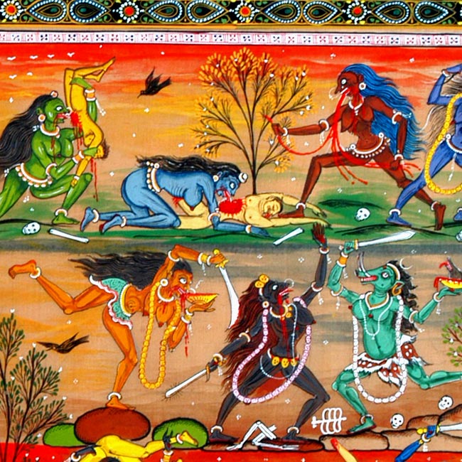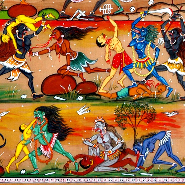 The fierce images of the Kali are treated in a detail and refine manner with the Goddess sucking the blood of the demons. The demons are moving from here to there to escape from the clutches of Kali. Patachitra style of painting is popular in Orissa and the style developed as a temple form of painting. This style is characterized by unique set patterns, lines, colours, poses and postures. Despite some limitations, the style shows unique formal simplification and superb colour orchestration. Traditional hues are blood red, red ochre, black, yellow, white and indigo blue. The palette contains pure pigments and vegetable dyes. For black, lamp-soot is used.