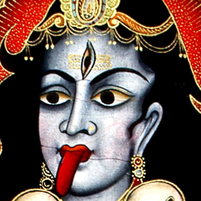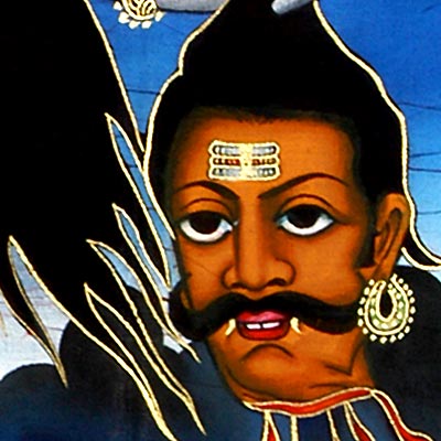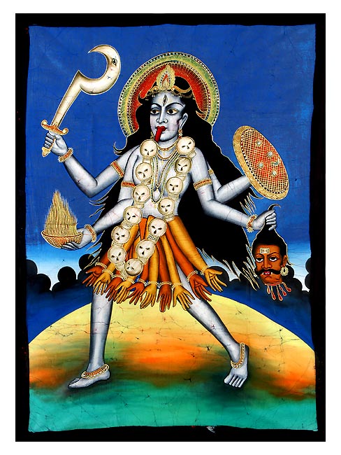 The ferocious image of the goddess Kali has been beautifully painted by the artists reflecting some of the basic characteristics of the Batik painting. She is wearing a garland of the human skulls on her neck and on her waist that of human hands. Identified with the spirit of destruction the lady god is holding the beheaded body of a human being on her one hand. The elongated lip shows a sense of fear.