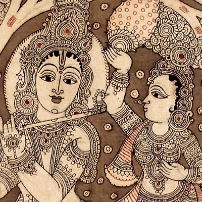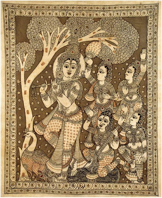 The beautiful Kalamkari painting depicts the Lord Krishna surrounded by four gopis in a most passionate manner. Lord Krisna was extremely popular among the gopis who craved for His company. The beautiful Kalamkari painting is a symbol of selfless love and affection. Literally meaning pen work, where a pen is used to trace outlines patterns and images, the Kalamkari technique involves drawing outlines with burnt tamarind twigs dipped in molasses and iron fillings. The vegetables dyes of deep shades are used to create epic and religious scenes. A sober final effect is created with repeating the process of colouring.