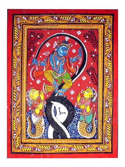 The Pata painting depicts Lord Krishna overpowering the Kaliya, the serpent. There was a great lake near the river Yamuna. Here resided the black and venomous serpent Kaliya. Due to his poisonous vapors, the surrounding area was so contaminated that no living being would dare venture near the place. One day Krishnas fellow cowherds went near the lake and after drinking water fell sick. Krishna after learning this said: I shall vanquish this king of serpents and release the inhabitants of the country from their continual dread. Following a fierce battle, Krishna overpowered the serpents and following the prayers by the wives of the Kaliya, he pardoned Kaliya on the condition that Kaliya would leave the place forever. The manner in which Krishna subdues Kaliya has a fascinating quality about it. The dance to victory, the effortless rhythm of the Almighty's pace of creation and destruction, the ease, the grace, the sheer play in the manifestations of the Lord's will, to which wind and water provide enchanted accompaniment, are beautifully brought out in the narrative. Indeed, this is the first inkling in textual material of Krishna as natwar (the dancer).