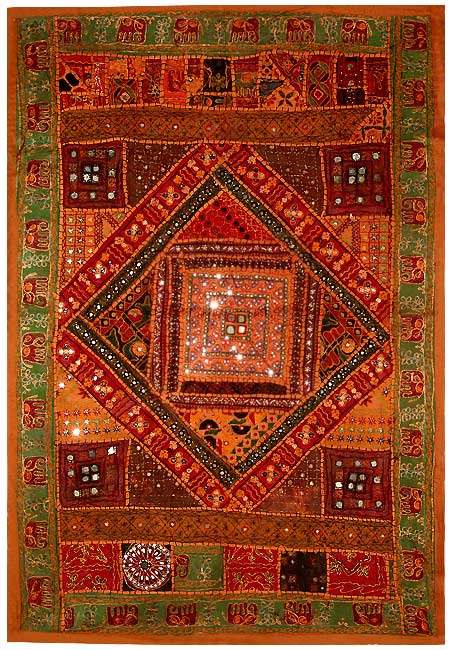 The beautiful wall hanging is a paradigm of beauty and excellent artistry. A number of beautiful designs are put together with some sparkling embroidery works. Maroon, light red, black all colours create a sort of riot of colour in the beautiful Gujarati tapestry. Nicely crafted mirror works yield a special eefect to the wall hanging.