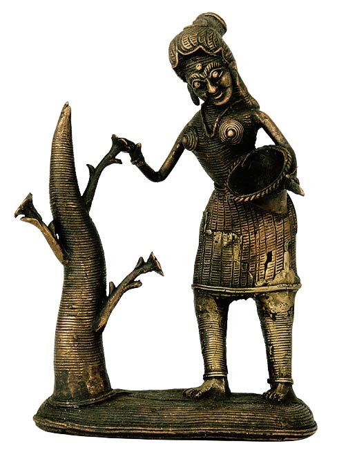 A sense of simplicity is manifest in this beautiful dhokra figure. The lady is plucking flowers for her beloved one. This spectacular work is chiseled with the ancient dhokra technique, which is a laborious lost wax process. First, a model is sculpted of clay and dried in the sun; it is then covered with beeswax and more clay, forming a mold. The piece is cast, cleaned and again dried in the sun. Finally, it is heated in the ground for five days and polished. This style is associated with the tribal groups of northern India, including Vindhyas and the Eastern Ghats, Bihar and its surroundings, Orissa, Madhya Pradesh and West Bengal. Myriad images are cast in the dhokra tradition as artisans preserve their millenary culture, custom and belief through the wondrous pieces they create.