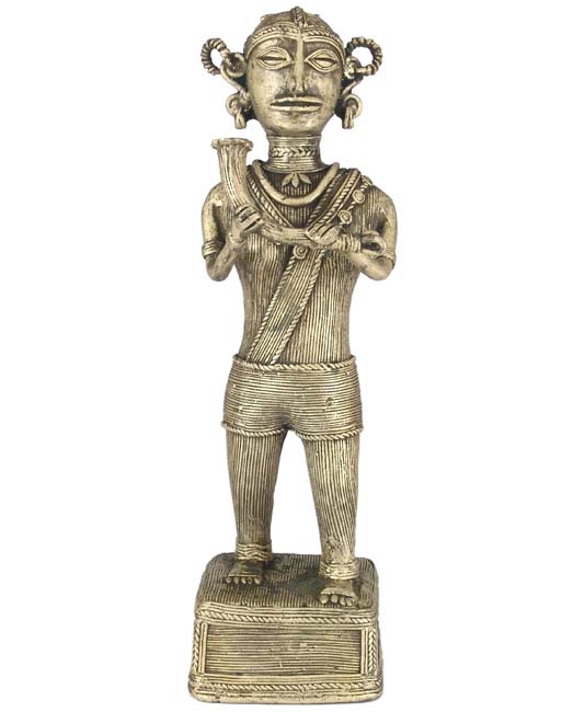 This portrayal of a tribal woman with musical instrument in Brass, in Dhokra art format, is alluring in more than one ways. Besides allowing one a fair glance into the various ornamental accessories/ jewelleries worn by womenfolk in the tribe, the metal idol is a fair instance of the aesthetic elegance the craft is capable of producing each time.