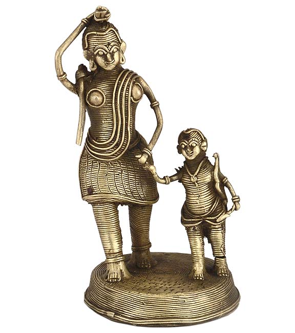 This Dhokra Brass statue of a mother with child is apparently inspired from the day-to-day life of a tribal woman from Central India. It presents a charming depiction of a robust and arduous tribal woman returning from work, possibly after cutting wood (as suggested by the axe hanging on her left shoulder). She is also a mother, as she holds on to the hand of her young child donning a bow (on his left shoulder) and an arrow (in his left hand).