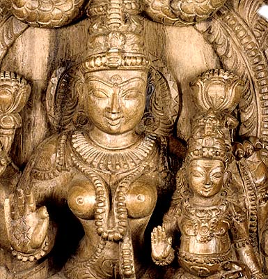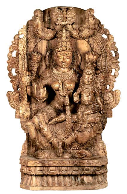 Lakshmi with Her Son Shrikumar in Her Lap - Wood Statuette