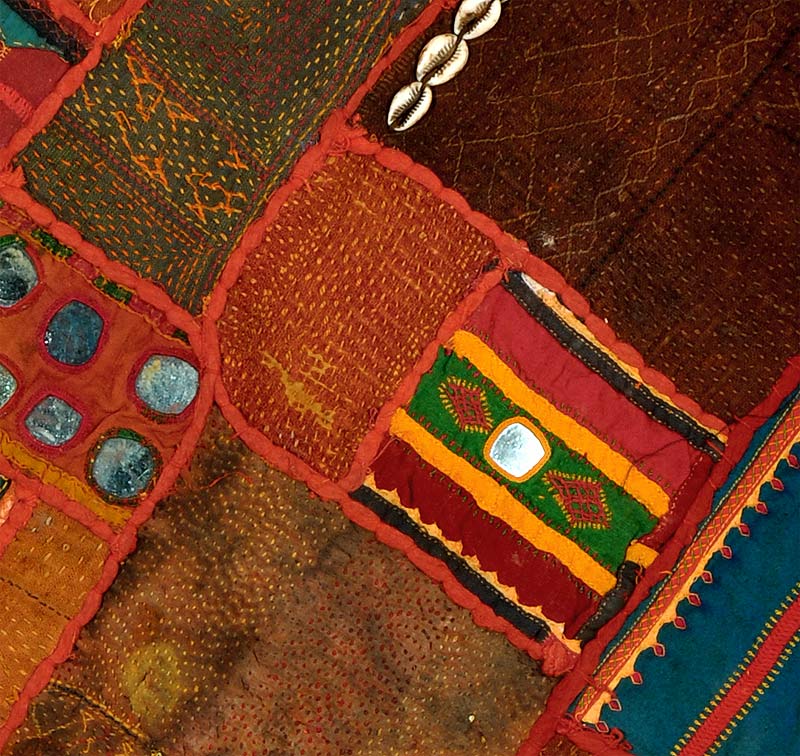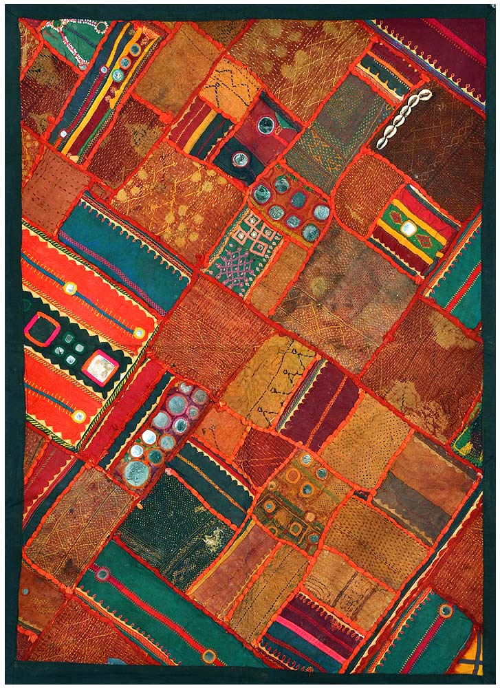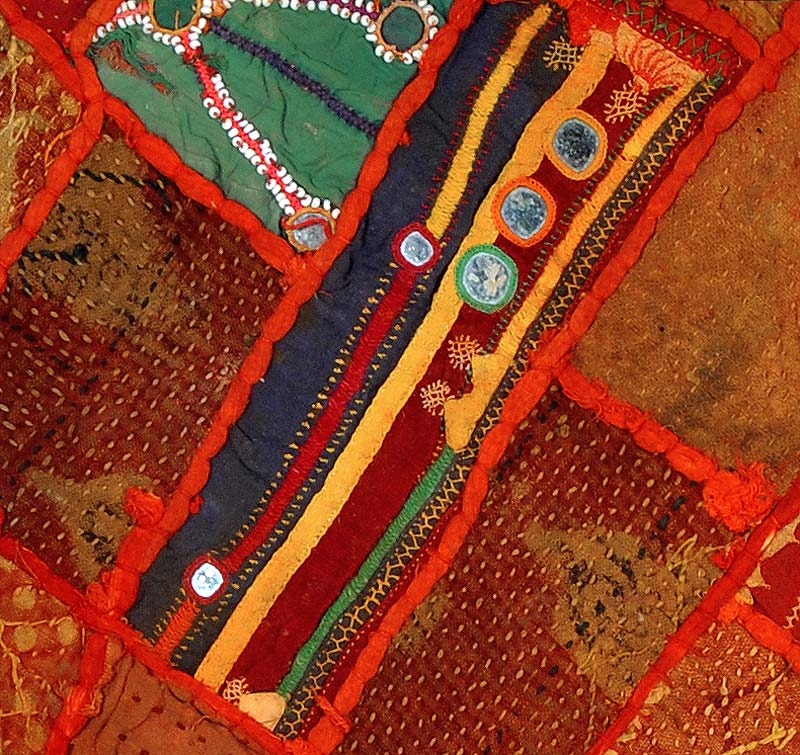 A unique piece of wall hanging with vibrant colorful patches of used old cloths, This Lambadi embroidery is an amalgam of pattern darning, mirror work, cross stitch, and overlaid and quilting stitches , the small and bold mirrors are neatly planted in an interesting manner and vivid cloth patches are assembled from the used pieces of mirror-speckled headdresses and skirts cloths worn by the 'Lambadi' women. In the dry, rocky area Karnatka and Andhra Pradesh reside the Lambanis, dressed in their colorful embroidered dresses strewn with mirrors, coins and shells he Lambani women practice this unique mirror and embroidery craft. This piece bears wonderful textures, each patch of cloth was collected and worn together very carefully, please note that some pieces of mirror may be broken and some are missing as these cloths are assembled on 'as is where is' basis.