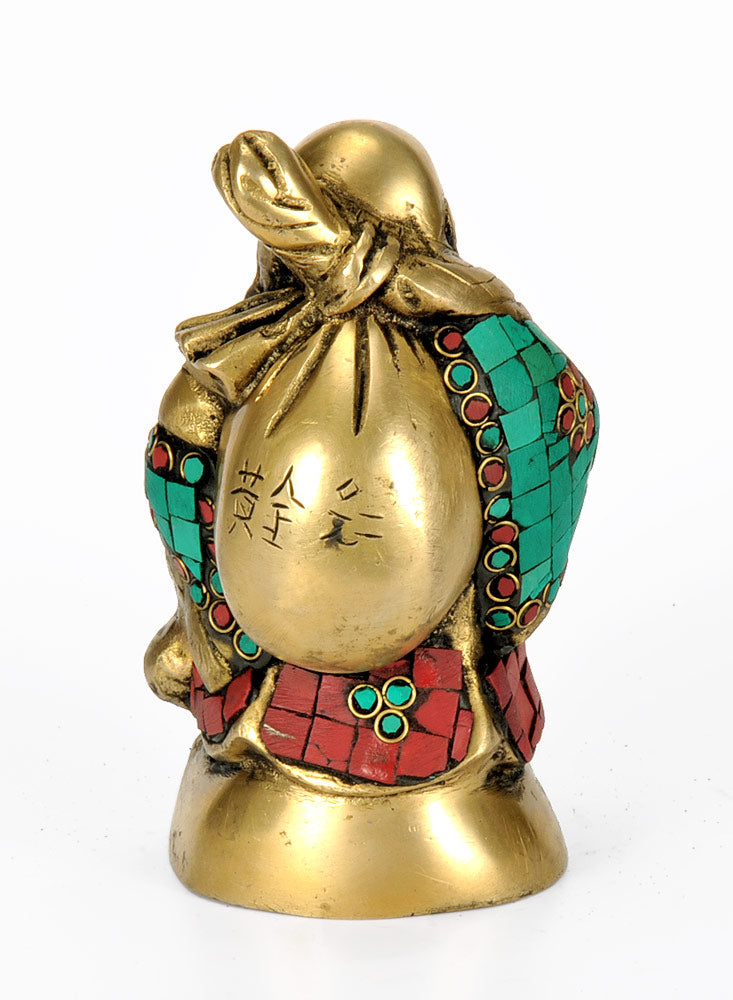 Here the auspicious figure of Laughing Buddha is nicely carved out with a deep sense of perfection and satisfaction. Brass, Reconstituted Turquoise and Coral are nicely placed together to create a spectacular figure.