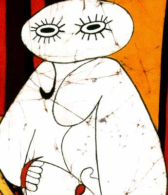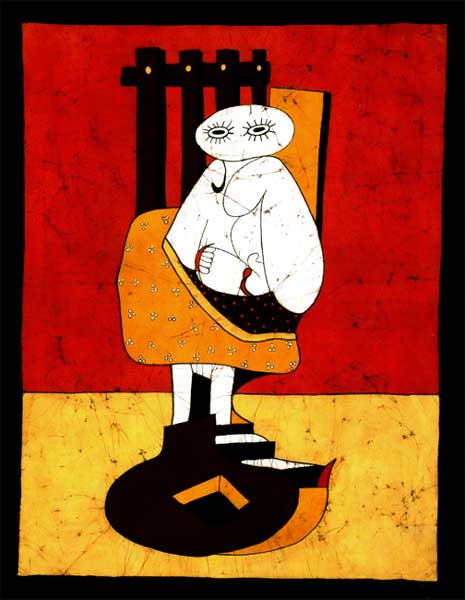 The lonely man is looking in desperation. He is filled in loneliness. A beautiful combination of colours has made the painting an attractive one. Orange, maroon, black and yellow have created a resplendent impact. A batik artist needs to have a good sense of colours and patterns. Line formations is also important to yield a beautiful impact. Though the motifs used in batik are simple, knowledge of color gradations and tack to remove wax finely are required.