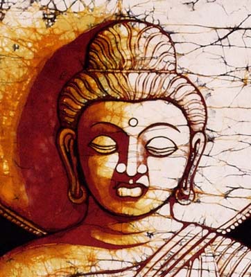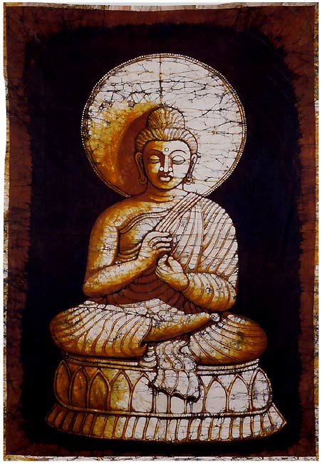 The gray painting of the Apostle of Truth and Non-Violence is given a spectacular treatment in the traditional batik style. A rare sense of gravity and self-satisfaction is manifest vivid in the beautiful painting. His red drapery is given a minute treatment and the method of waxing and de-waxing gives rise to a special and attractive effect to the painting. Batik prints of West Bengal, Orissa and Tamil Nadu are known for their originality, uniqueness and fineness. Batik is the art of creating images on the cotton cloth using wax resist method.