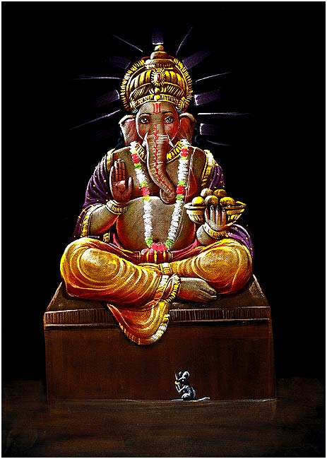 The beautiful velvet painting depicts the Lord of Wisdom and the Remover of Obstacles, Lord Ganesha in beautiful manner. A deeps sense of gracefulness and accomplishment is manifest in the beautiful painting. The Lord is holding a bowl of sweets, as he is extremely fond of sweets. He is wearing lot of wearing a lot of ornaments. Lord Ganesha is one of the most worshipped gods in Hinduism and he is worshipped at the beginning of any ritual.